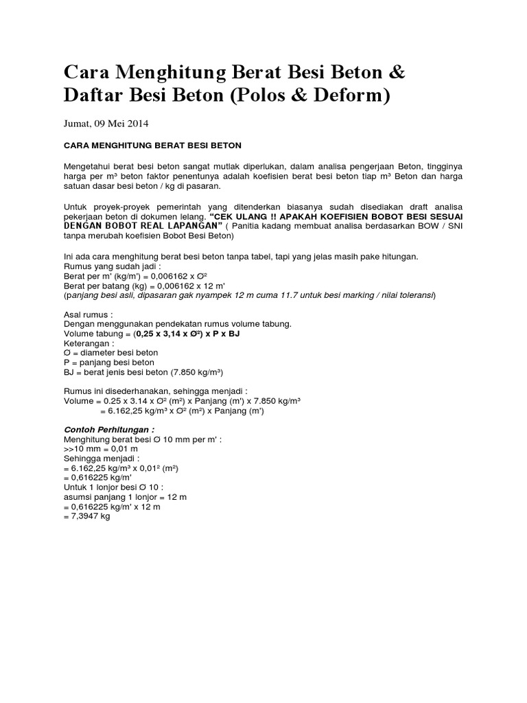 Cara Menghitung Berat Besi Beton Polos : Nah ubah dulu 7mm jadi 0,007m baru kita masukan ke rumus yang sudah disederhanakan = 6.162,25 x 0 dalam membeli besi beton yang berkualitas sni dan terpercaya, anda boleh mengecek terlebih dahulu ke toko kami baik via telepon, sms, wa atau.